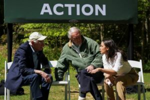 U.S. Senator Bernie Sanders (I-VT), U.S. Representative Alexandria Ocasio-Cortez (D-NY), and U.S. Senator Ed Markey (D-MA) sit together, at an event to commemorate Earth Day during a visit to Prince William Forest Park in Triangle, Virginia, U.S., April 22, 2024. REUTERS/Kevin Lamarque